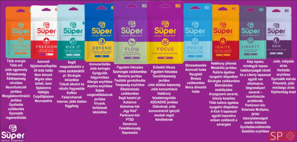 - Jelenleg: Freedom (fájdalom csillapító), REM (alvás segítő), Victory (fizikai erőnlét javító), Focus (agyműködés serkentő), Defend (immunrendszer erősítő), Flow (koncentráció), Peace (stresszoldó), Liberty (alap tapasz, mozgás javító, más tapaszok hatását erősíti), Ignite (fogyasztó), Kick It (rossz szokások ellen)